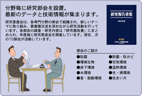 専門技術者、大学の研究者、住宅・部材メーカー、健康住宅に関心のある方等の幅広いネットワークを活かし、住宅の健康阻害要因に対する解決策を研究し、住まいの品質向上に貢献します。