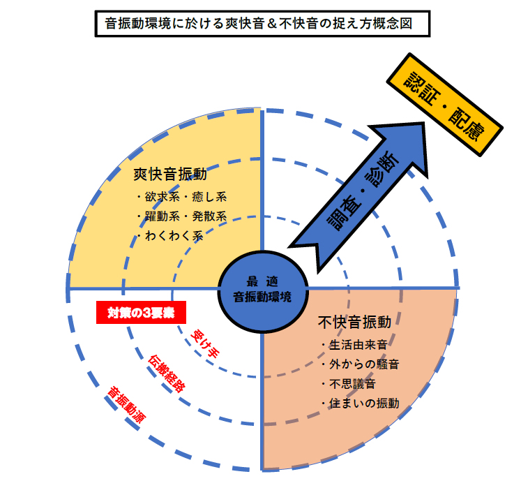 音は睡眠のみならず休息や心情に大きく関与しています。健康住宅における音振動環境は不快音を分別し適切な配慮から、安らぎや活力の醸成となる爽快音の活用が求められます。